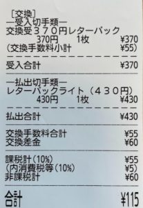 ただ今回はきちんとした場面(370持ってこないでとの案内があった)での用途で気持ち的に「430」と印字された封筒が必要だったため、本体交換を選択しました。結果、前述したとおり差額60円+手数料55円=115円で交換できました。手続きはとてもスムーズで、未使用の封筒を持参すればすぐに対応してもらえます!